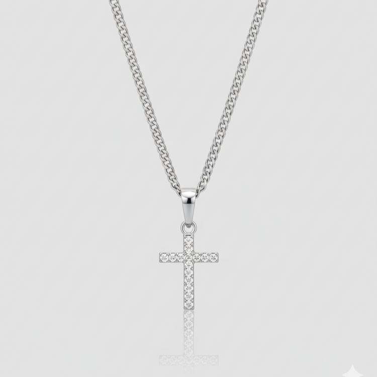 Su diseño minimalista de cruz combina elegancia, significado y presencia discreta. La cadena cubana aporta refinamiento, convirtiéndolo en un accesorio versátil y atemporal.
