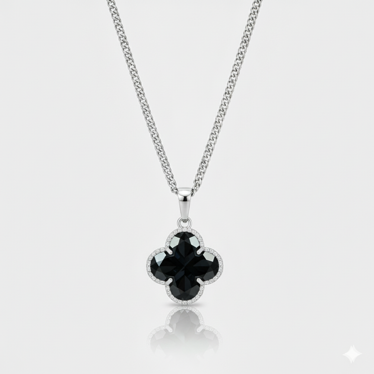 El trébol negro simboliza protección, equilibrio y buena fortuna, combinando elegancia masculina con un diseño sobrio y poderoso. Su presencia sobre la cadena cubana aporta carácter, sofisticación y estilo distintivo.
