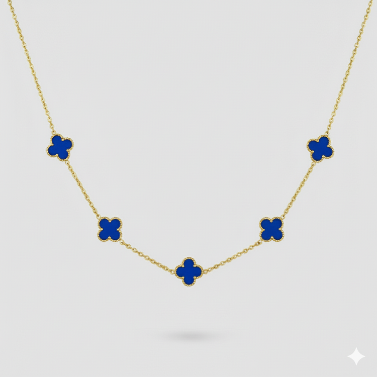 Cinco tréboles azul marino evocan serenidad, confianza y sabiduría, combinando sobriedad y elegancia masculina. Su diseño transmite presencia refinada y sofisticación atemporal, ideal para un estilo distinguido y contenido.