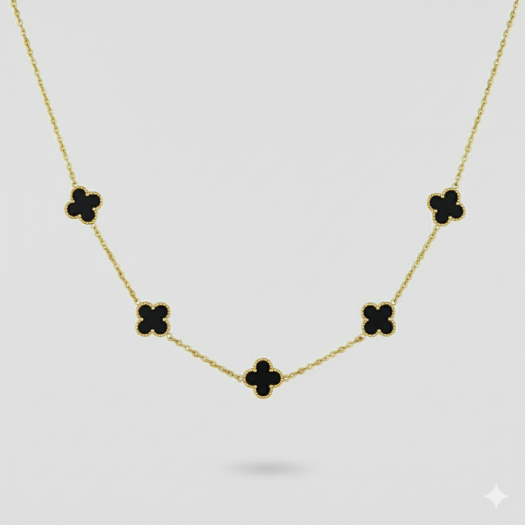 Cinco tréboles negros simbolizan protección, equilibrio y fuerza interior, combinando elegancia masculina con un diseño sobrio y poderoso. Su presencia transmite sofisticación atemporal y carácter distintivo.
