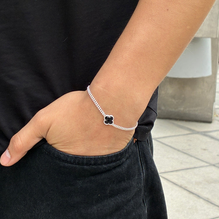 La Pulsera Lucky Silver Negra está inspirada en la elegancia y la fortuna, combina minimalismo y estilo atemporal en cada detalle.