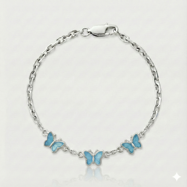 La Pulsera Mariposas Celeste posee tres mariposas finamente detalladas que combinan delicadeza, elegancia y estilo refinado. Su diseño sutil aporta presencia sofisticada y un toque distintivo a cualquier look.