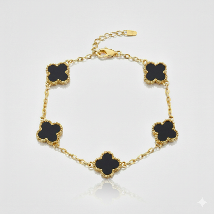 Cinco tréboles negros simbolizan protección, equilibrio y sofisticación, combinando elegancia masculina con carácter y presencia discreta. Su diseño transmite misterio refinado y estilo atemporal.